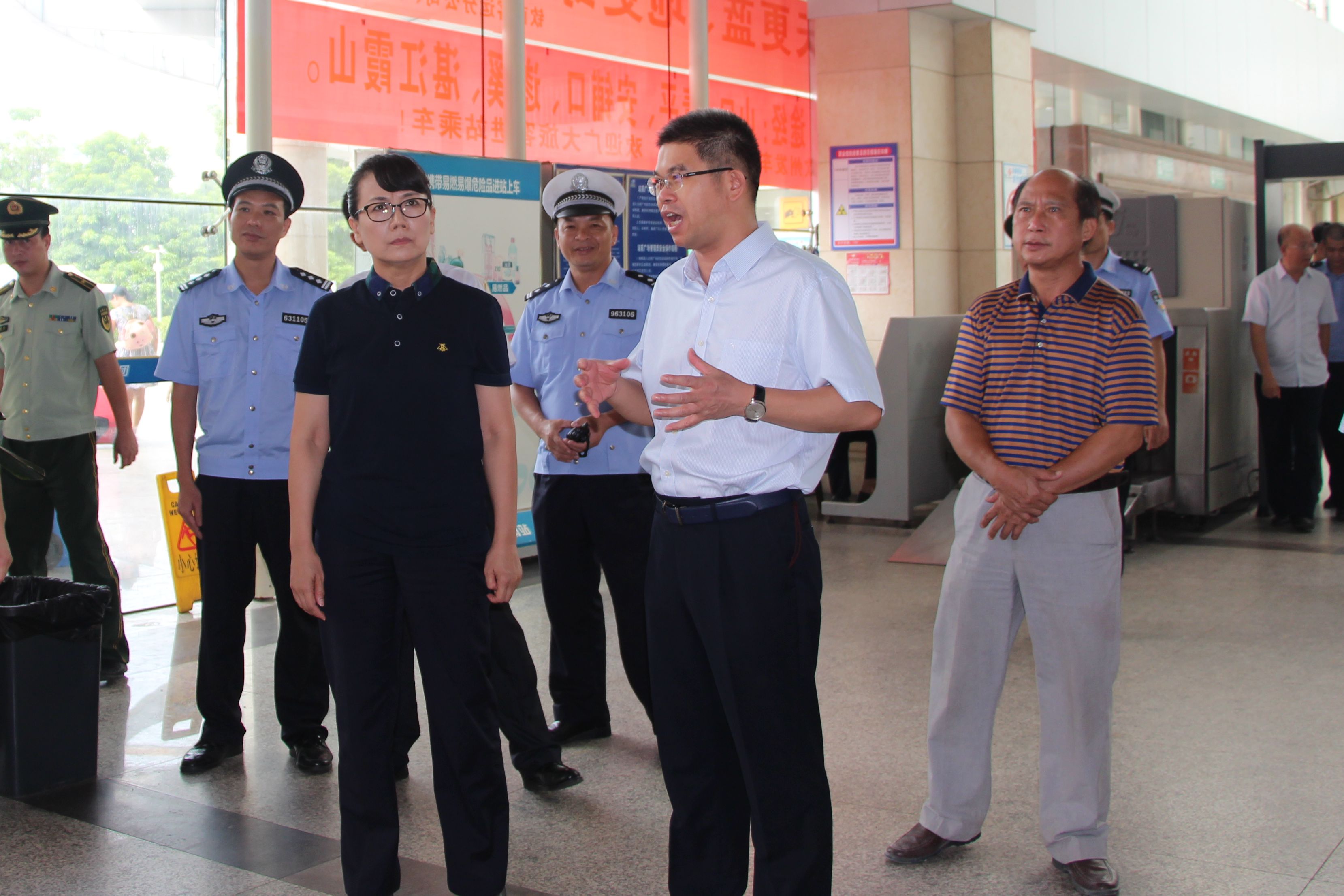 9月5日,钦州市副市长、公安局局长郭晓红率市交通运输局、公安局交警支队等部门负责人到汽车南站开展全市道路交通及消防安全联合检查行动。集团董事长黄祖强、运输集团副总经理卢勇以及相关部室负责人陪同检查。