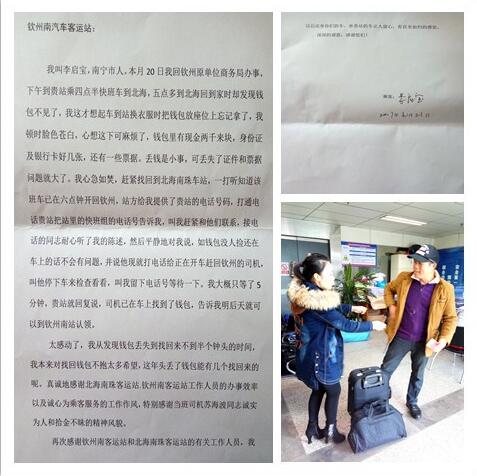 “感谢快班车司机拾金不昧,感谢你们车队工作人员的热心帮助,我钱包里的钱物分毫无损失而复得,太感谢了!”日前,旅客李先生专程来到钦州汽车南站送来感谢信,向快班司机苏海波、车队管理员韦箫表示感谢。