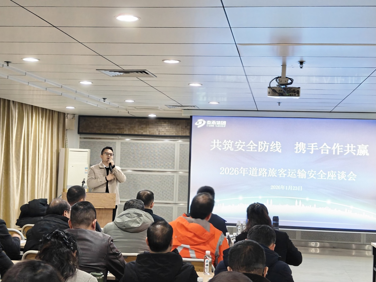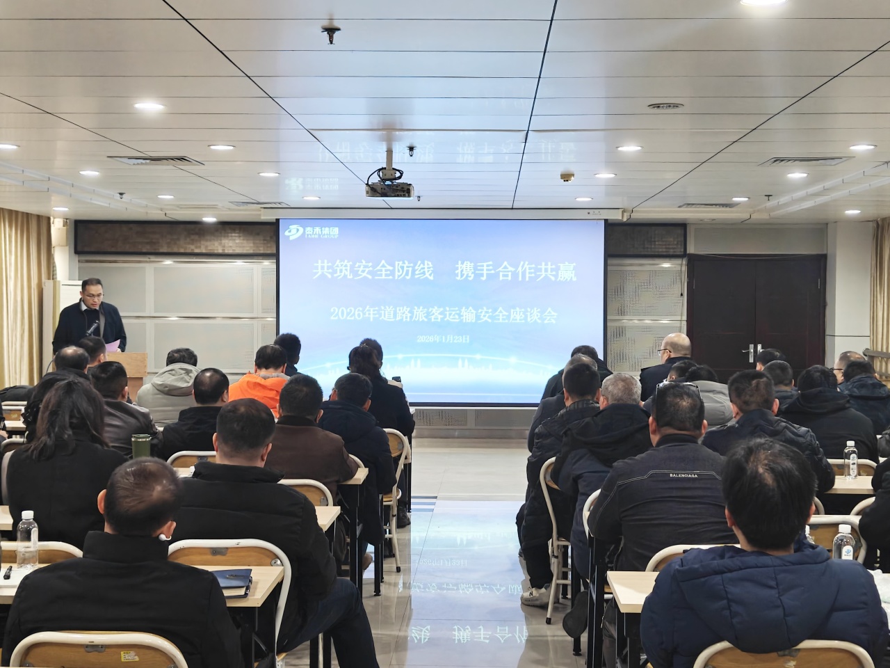 岁安春启守初心,政企同心护民行。为切实筑牢道路旅客运输安全屏障,深化隐患排查治理,强化风险精准防控,全面夯实2026年春运及全年客运安全工作根基,1月23日下午,2026年道路旅客运输交通安全座谈会在钦州泰禾公司本部召开。会议由钦州泰禾公司安全运输技术部副总监翁开锐主持,钦州交警二大队警长黄祥军、三大队警长肖荣志,广西道路运输协会会长钟世新,平安保险广西理赔运营中心副总经理邹宇,集团公司副总经理、客运物流运营总经理宁豪杰,集团公司副总经理、钦州泰禾公司总经理曾概成等领导,以及各二级公司、基层客运单位安全管理责任人共计50余人参加会议。