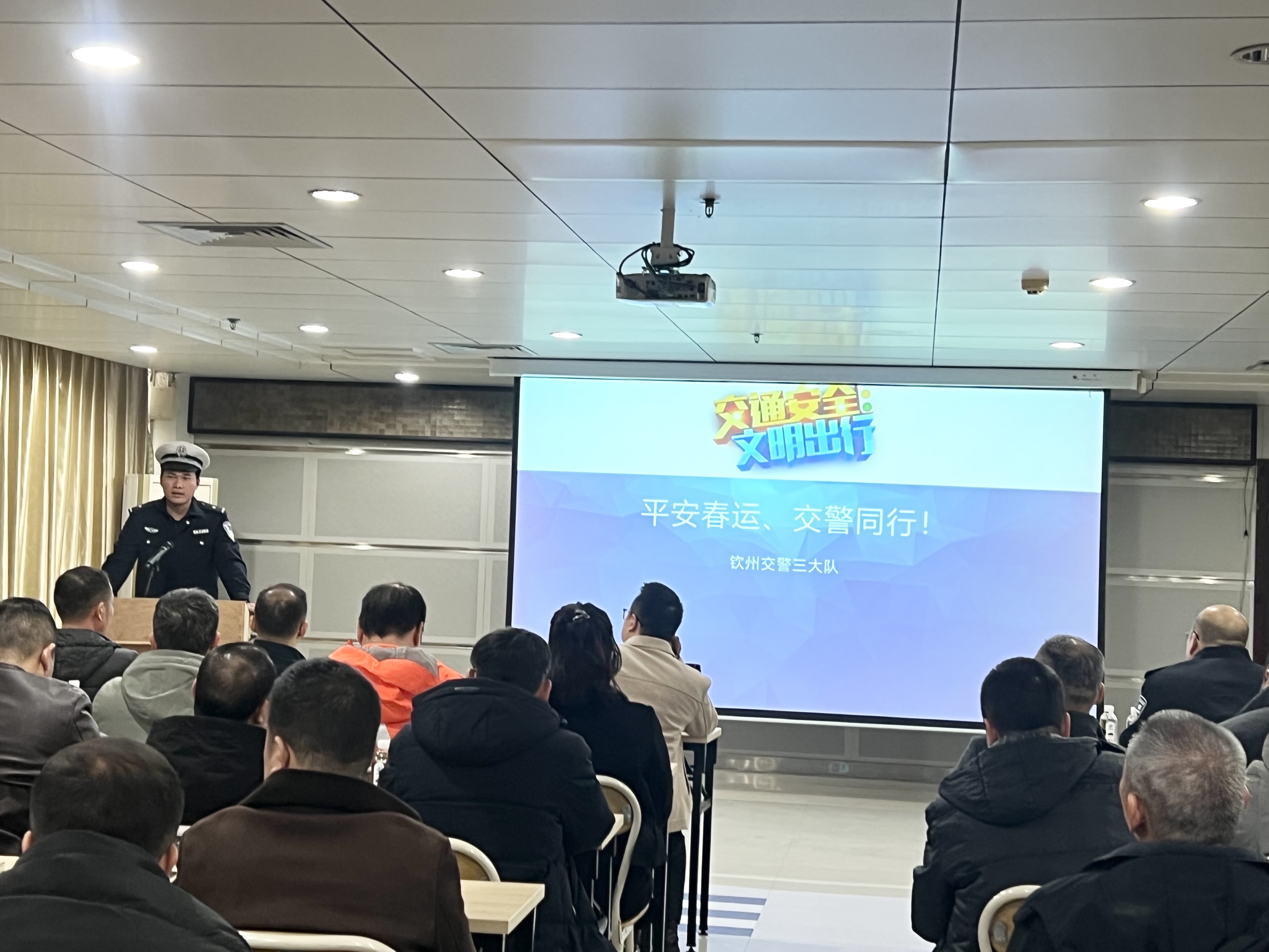 随后,钦州市公安局交通警察支队三大队警长肖荣志围绕“平安春运 交警同行”主题开展分享交流。他结合岁末年初道路交通安全特点,分析当前客运行业发展形势,解读春运期间安全管控相关要求,深入剖析典型事故案例,着重强调驾驶员规范操作与车辆安全管控的关键作用,为平安客运工作提供了专业的安全指导。
